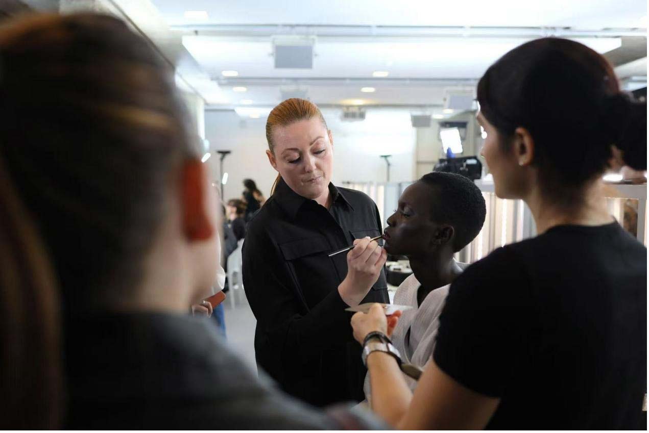 TOM FORD 创意总监 Haider Ackermann 携手品牌全球彩妆大师 Lucy Bridge,从秀场造型汲取灵感,打造模特妆容。秀场以海军蓝镜光地板为画布——映射出本季妆容主调:极镜光感叠染双唇、眼妆眸光流转、肌肤散发健康光泽。多维立体、光影映射、与本季秀场造型色彩呼应:柔和奶油、温润棕调、水彩桃粉与深邃朱古力。绝色欲吻难拒,优雅之下,锋利潜藏。