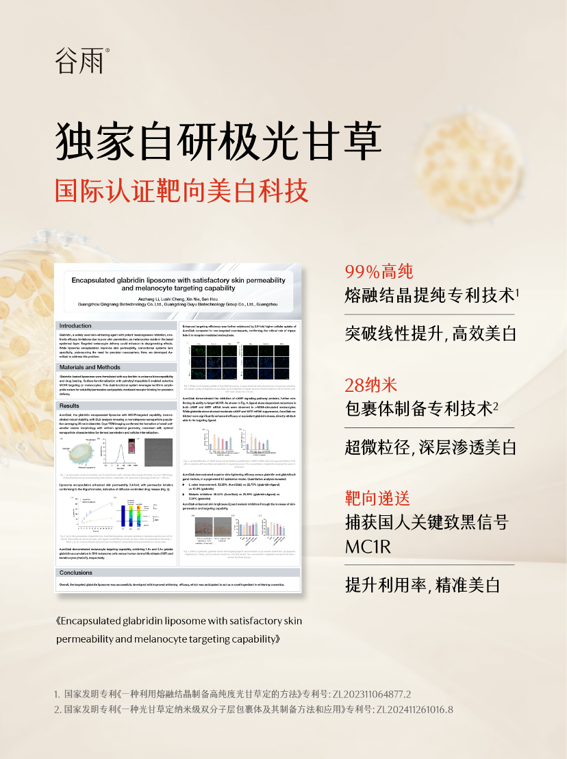 特别是在2024年,谷雨突破性将光甘草定升级为“极光甘草”。依托独家发明专利“熔融结晶提纯技术”,谷雨成功突破光甘草定的提纯瓶颈,将其纯度推向99%的行业最高水平。同时,通过另一自研专利技术“28纳米包裹技术”与先进的靶向递送系统,使光甘草定的透皮吸收效率提升 3.4 倍并能精准识别抓取黑色素细胞。在三大技术突破的加持下,“极光甘草”极大提升了美白效果的精准性与稳定性,为消费者带来高效、安全且温和的美白体验。也正因谷雨在美白赛道上的持续深研所带来的底气,让其所推出的美白产品获得了消费者的高度认可和信赖,并多次登榜不同平台的销售和回购榜榜首,为此次荣获“国货美白护肤第一品牌”的行业地位认证奠定了重要基础。