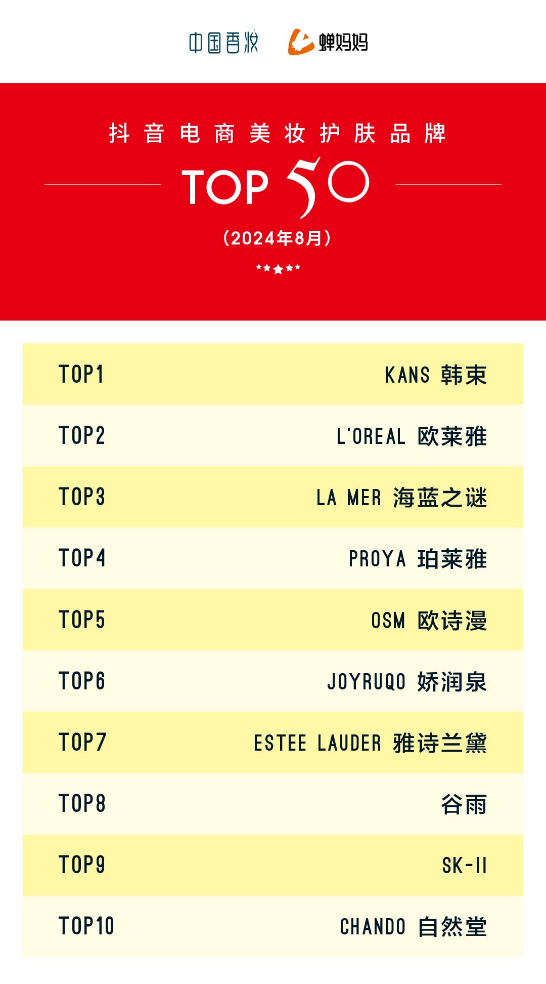 抖音电商美妆护肤品牌TOP50(2024年8月)