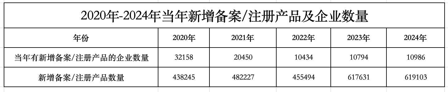 此外,从品牌企业的数量来看,大量不具备原创能力的品牌已经被淘汰。新规实施前的2020年,当年有新增备案/注册产品的企业数量高达3.2万家,但对应的新增注册/备案产品只有43.8万件;到2024年,当年有新增备案/注册产品的企业数量缩减到1.09万家,但对应的新增备案/注册产品增长到61.9万件。