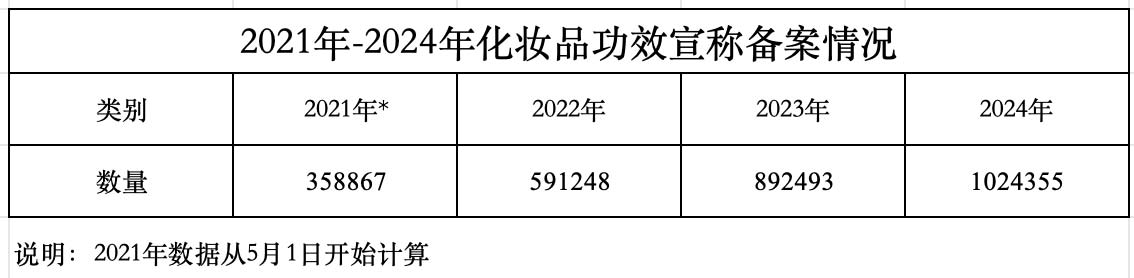 企业在化妆品功效宣称方面的备案数据从2021年的35.89万件激增到2024年的102.44万件。化妆品企业不仅积极进行功效宣称备案,头部企业还开始和医院联合,对功效型化妆品进行临床实验,设立转化医学基金,加强对化妆品的研发。