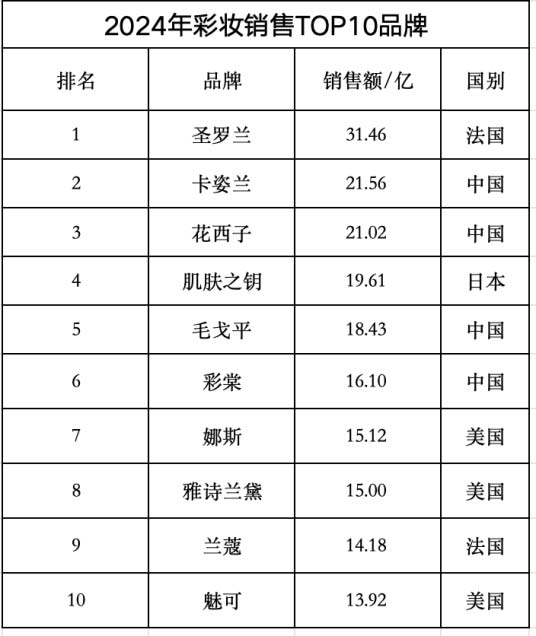 尤其是在彩妆市场,2024年销售额排名前10的品牌中,卡姿兰、花西子、毛戈平、彩棠等通过弘扬中国传统文化,开发独具中国文化特色的产品,获得了海内外消费者的喜欢和认可,销售额持续稳居前十。