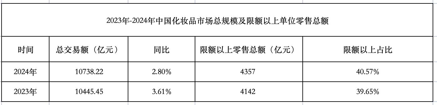 中小企业面临比较大的合规成本压力。2023年中国化妆品市场的总交易规模约为10445.45亿元,其中限额以上单位的零售额为4142亿元,占比39.65%;2024年中国化妆品市场总交易规模扩大到10738.22亿元,限额以上单位的零售总额为4357亿元,占比提高到40.57%。随着化妆品产业整体向高质量发展,限额以上单位的零售总额占比可能还会扩大。与此同时,需要考虑的是,如何兼顾中小企业的发展,如何让真正有创新能力的中小企业脱颖而出。为中国化妆品产业的持续繁荣发展,注入更多的高质量新鲜血液,是一项值得重点关注的事情。