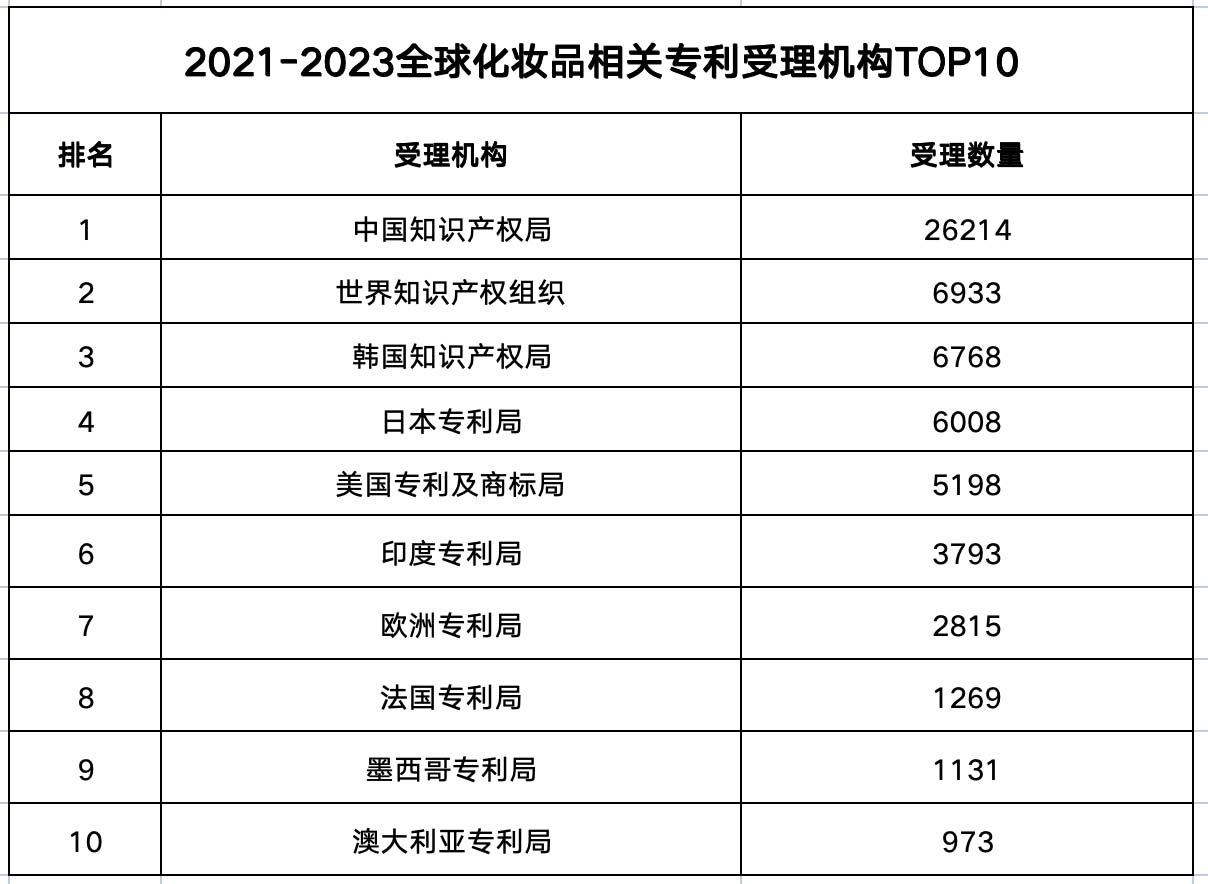 2021年以来,中国已经成为化妆品相关专利申请的最大受理国,2021年到2023年间中国知识产权局共受理化妆品相关专利申请26214起,占全球总量的38.55%(全球总量为67997项)。这意味着化妆品的研发和创新基地在向中国转移。