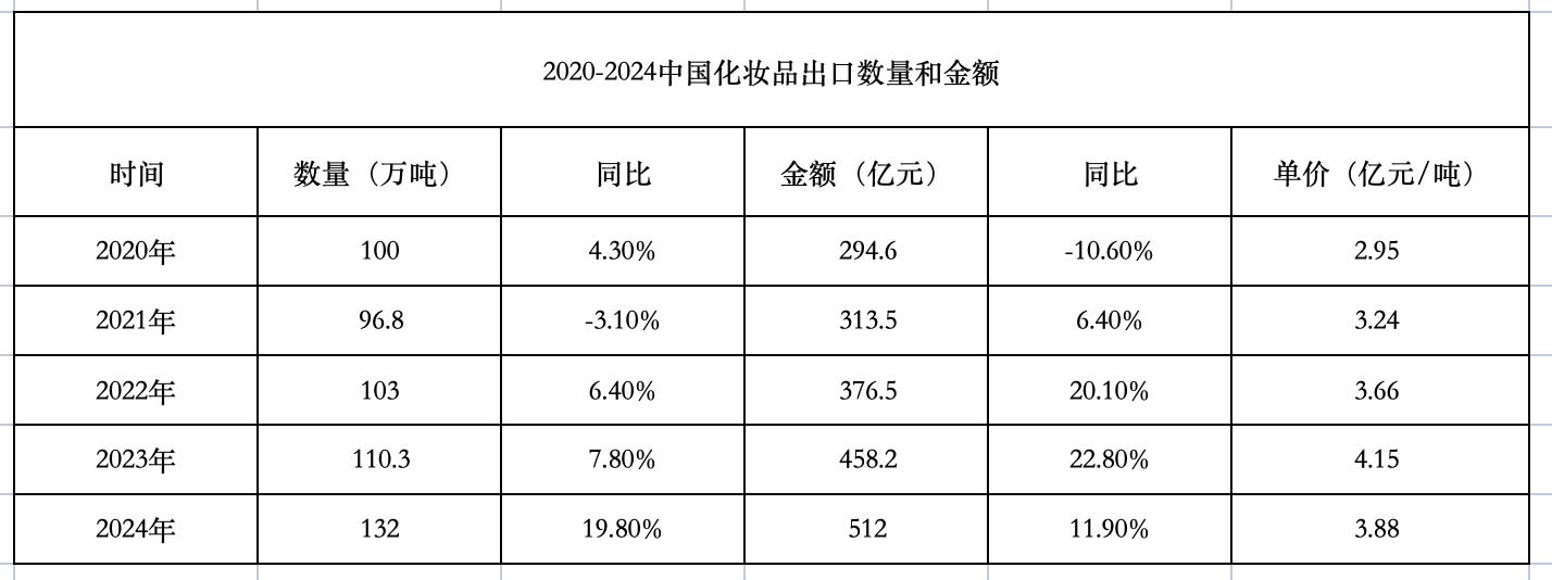 数量上,从2020年的100万吨增长到2024年的132万吨,增长32%;金额上从294.6亿元增长到512亿元,增长73.8%。同时,单价从2.95亿元/吨增长到3.88亿元/吨,价格提升31.5%。这说明,中国的化妆品已经在开始摆脱“代工出海”的地位,开始实现品牌出海,溢价能力在提升。