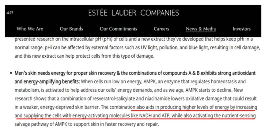 最近几年,看到有越来越多的化妆品品牌,如雅诗兰黛,欧莱雅,珀莱雅等,开始打“能量护肤”的概念了,其基本逻辑是:细胞随着年龄或外界刺激的影响,使得其能量不足,会引起一系列的皮肤问题。通过使用一些活性成分给细胞提供能量,让其状态“满血复活”,使这些皮肤问题得到改善。品牌在宣传能量护肤的时候,会带出一系列普通消费者听不懂的专业名词:如ATP,TCA循环(三羧酸循环),NAD+,线粒体,AMPK,SIRT等。下面我就结合市面上一些宣称能量护肤品牌的研究,和大家聊一聊能量护肤的一些技术奥秘吧。