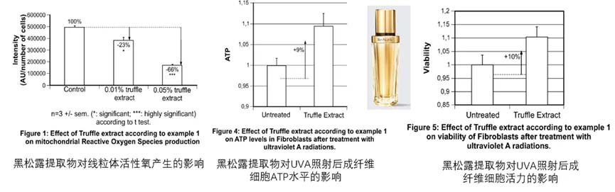 黑松露提取物能够减少线粒体活性氧(ROS)的产生,增加三磷酸腺苷(ATP)的产生以及在外部应激(例如紫外线辐射暴露)后增加细胞活力。该专利研究应用于雅诗兰黛白金黑松露精华[6]。