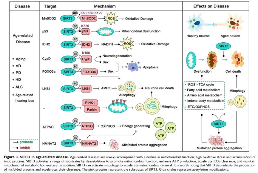 四川大学华西医院对SIRT3在年龄相关疾病中的作用机理也进行了深入研究[7]。发现与年龄相关的疾病总是伴随着线粒体功能的下降、高氧化应激和有毒蛋白质的积累。SIRT3 通过脱乙酰化激活一系列底物,以促进线粒体功能、增强 ATP 产生、加速 ROS 清除并维持线粒体代谢稳态。此外,SIRT3可以激活线粒体自噬,加速线粒体更新。值得注意的是,SIRT3 还可以抑制错误折叠蛋白的产生并加速其清除。粉色蛋白质代表 SIRT3 的底物。灰色圆圈代表乙酰化修饰。