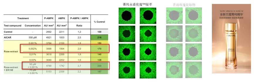 欧菜雅在体外实验中,发现极少量(0.002%)的菁纯永盛玫瑰提取物就可以提高70%的AMPK表达,如果和辛酰水杨酸(ER195)一起作用,那么提升的幅度更大,可以达到130%。在全新兰蔻菁纯精华中,也加入了辛酰水杨酸来帮助实现更强大的抗老力量。玫瑰凝萃在调节细胞的愈合和分化速度方面,远胜于普通的玫瑰提取物。