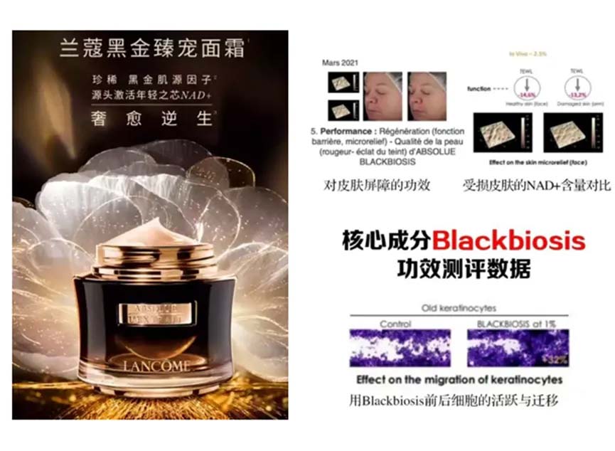 欧莱雅Blackbiosis 【出芽短梗霉发酵产物】 ,在浓度仅为0.5%时,它就能提高27%的NAD+生成,让细胞的能量更充沛。该活性成分应用于兰蔻黑金面霜。