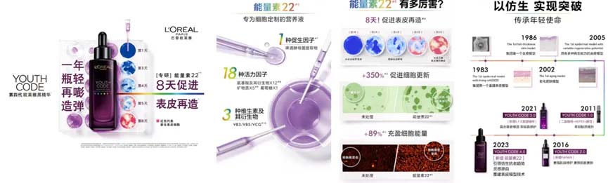 欧莱雅通过40年精研仿生表皮再造科技,重磅首发新成分——能量素22,灵感源自仿生细胞培育液,精准高效提供22种细胞所需能量成分。直击肌肤年轻三大关键:促进细胞新生,填平细纹,增强肌肤弹力;充盈细胞能量,使细胞更加活跃,刺激更多胶原蛋白生成;养细胞造新皮,只需8天即可促进表皮再造,焕生新皮肤。因为能量素22是一个经过多次配比后调制出来的最适用于人体肌肤使用的活性成分组合,所以敏感肌也适用,温和不刺激,清爽好吸收。