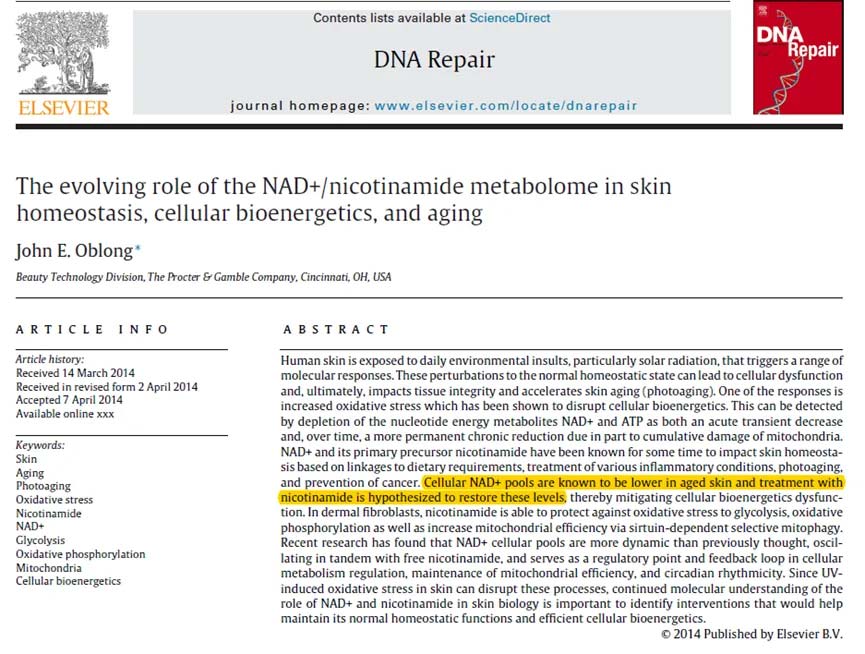 2014年,宝洁发了一篇文献讲述烟酰胺和NAD+的关系,并证明可以用烟酰胺来提升皮肤内的NAD+水平,从而实现抗老和修护的能力[8]。