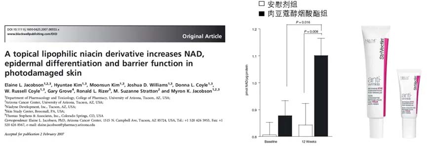 一个美国品牌StriVectin斯佳唯婷,在2007年开发了一个成分【肉豆蔻醇烟酸酯】,它是烟酰胺的一种衍生物,也被称为NIA114(目前专利已经过期),证明了涂抹NIA114能够提高皮肤内NAD+的水平,角质层的厚度和皮肤的含水量都会因此而提高[9]。