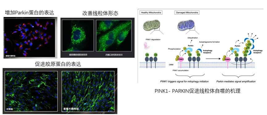 珀莱雅买了一个很贵的设备(安捷伦Seahorse XF海马生物能量代谢测定仪),专门用来研究细胞能量代谢。珀莱雅找到了一个和线粒体自噬相关的通路( PINK1- PARKIN[11]),发现了紫檀芪可以有效促进线粒体自噬(增加Parkin蛋白的表达),让细胞恢复活力,并能够显著提升胶原蛋白的表达(+112.7% )。