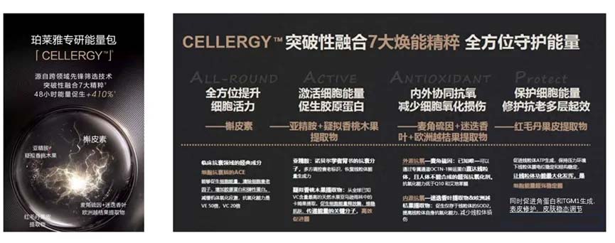 此外,珀莱雅的能量精华系列里面,还搞了一个集合7大焕能精粹的能量包CELLERGYTM,各成分的作用功效如下图所示。