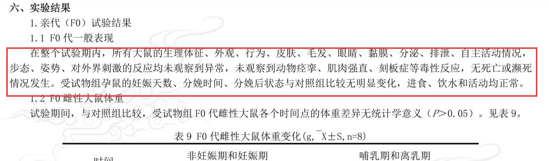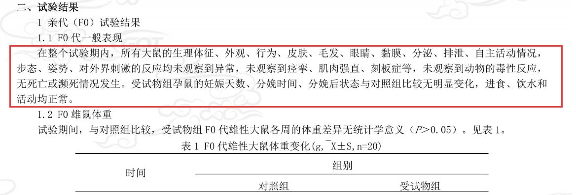 (2)“无损害”实证(拓展一代生殖发育毒性试验):该试验对亲代(F0)及子代(F1)进行了全周期的神经、免疫及生殖系统观察。结果显示,受试物对子代的生长发育无任何有害影响,其“未观察到有害作用水平(NOAEL)”表现优异。