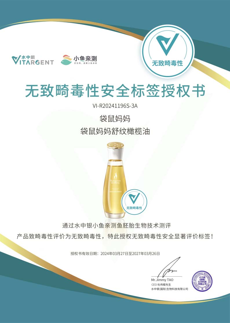 据了解,在完成以上“新功效”相关测试之前,袋鼠妈妈也在业内率先引入了“鱼胚胎生物技术测评”,产品获得“产品无致畸毒性安全显著评价标签”,让用户基于安全实证而做出产品选择。
