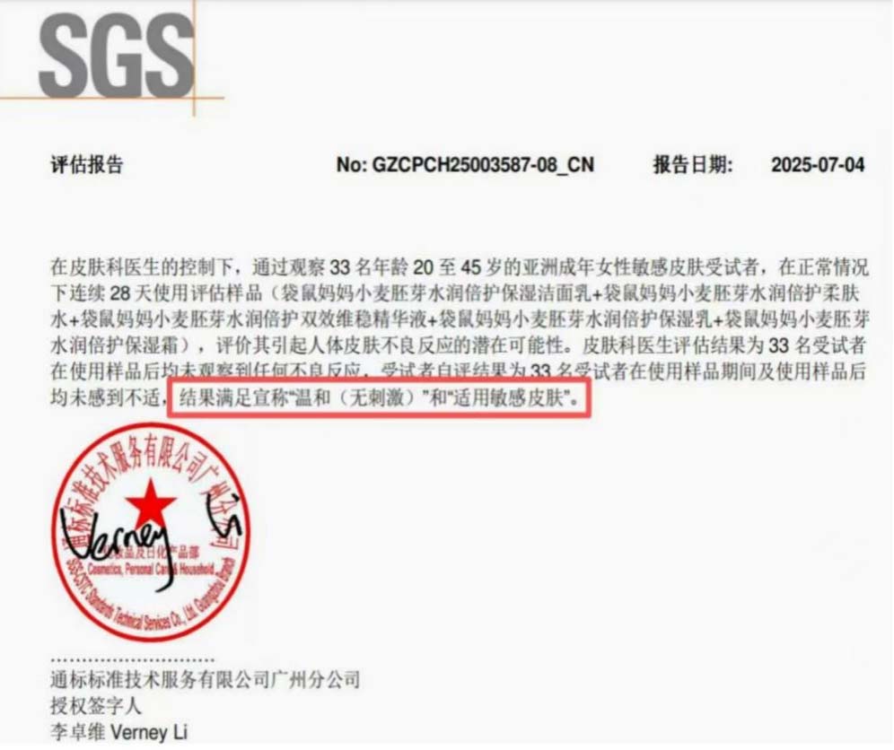 此外,SGS出具的评估报告(编号:GZCPCH25003587-08_CN)提供了直接的人体试用实证。在皮肤科医生参与下,33名年龄20至45岁的亚洲成年女性敏感皮肤受试者,连续28天使用袋鼠妈妈小麦胚芽水润倍护系列。经专业评估,所有受试者均未出现任何皮肤不良反应,受试者自评也无不适反馈,试验结果满足“温和(无刺激)”及“适用敏感皮肤”的宣称,为产品适用敏感肌人群的安全性提供了人体试用依据。