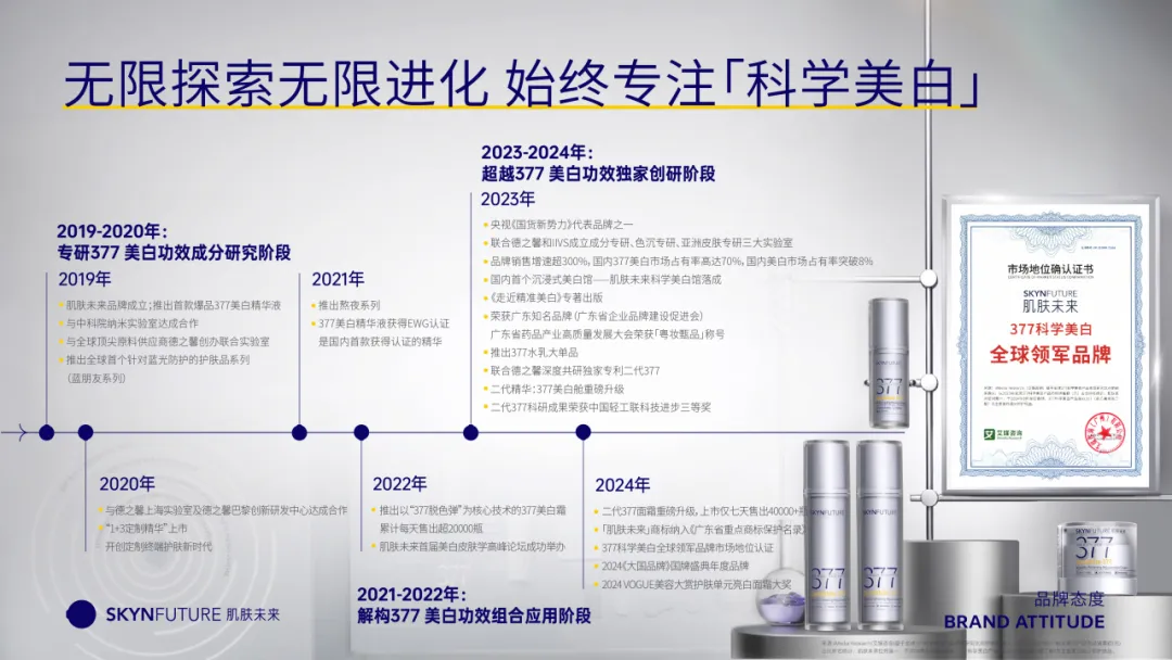 从首款爆品377美白精华液到一代377面霜,再到全新升级的二代377系列,肌肤未来正不断拓宽377科学美白产品矩阵。截至目前,肌肤未来拥有以377为主打成分的美白特证产品数量创国内行业先锋。