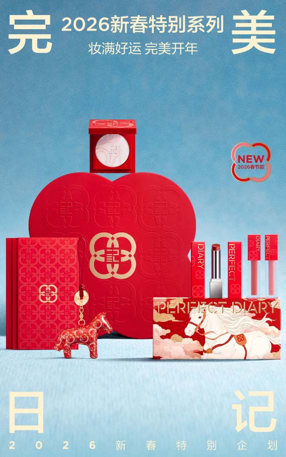 2026新年到来之际,完美日记倾心呈现新春特别系列,该系列包含第三代“仿生膜”精华口红、首创“仿生膜”精华唇釉、“小蓝锁”精华蜜粉饼与探险家十二色眼影“开年瑞马盘”,本次设计以好运马蹄铁与四合如意纹两种吉祥符号为灵感,巧妙融合前沿科技与传统美学,为新春妆容增添一份惊喜。此次,完美日记将美好祝福与对未来希冀融入每一款单品,愿此系列为新春妆点光彩,陪伴每一位消费者于丙午马年妆满好运,完美开年。