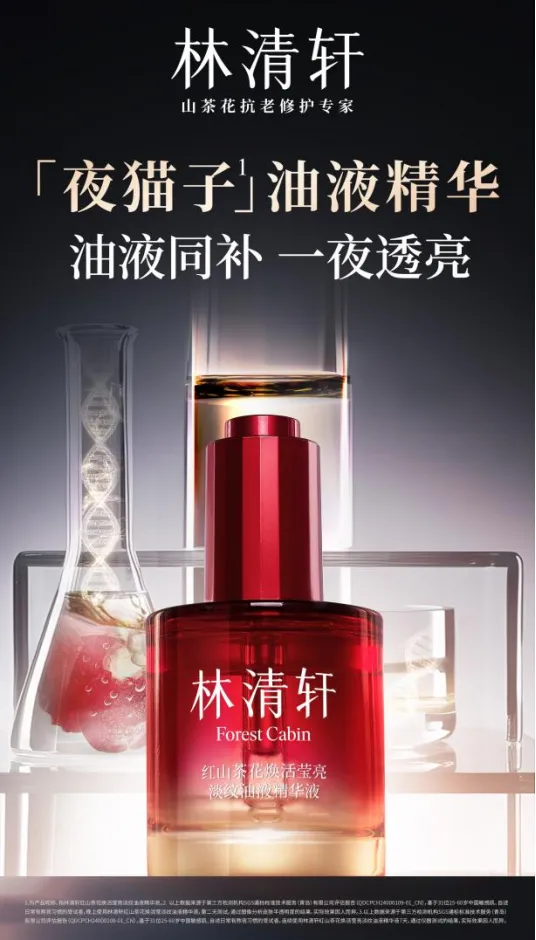 林清轩夜猫子油液精华打破水油双相和含乳化剂的传统配方,创新采用油液同补,20%精华油加上80%精华液的黄金配比[2] 。