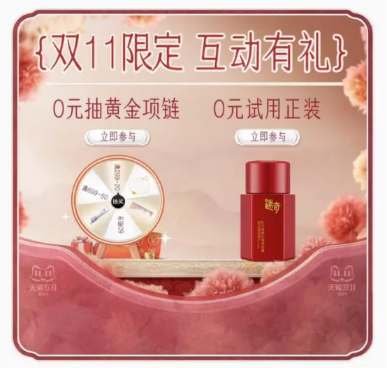 在天猫平台上,迷奇在基础满减规则的基础上,又采取了满赠策略,有效提升了客单价及复购率。同时,在迷奇天猫主页增设了大转盘赢黄金项链/免单的趣味活动,进一步激发了消费者的购买欲望。此外,还特别推出了0元试用牡丹焕颜抗皱美容蜜的活动,旨在让更多尚未了解迷奇品牌的消费者能够亲身体验到迷奇产品的卓越品质。通过这一举措,更进一步拓宽品牌的影响力,吸引更多潜在消费者的关注和喜爱。