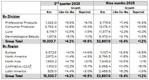 全球美妆巨头欧莱雅集团近日发布2025年前三季度财报,数据显示公司实现销售额 328.07 亿欧元,按可比口径和相同汇率计算同比增长 3.4%,调整后增长3.7%。尽管公司销售增长连续两个季度未达市场预期,北美等地区增速持续放缓;但北亚区实现两年来首次正增长,成为欧莱雅现有业绩的一大亮点。其中,中国大陆市场第三季度增速达中个位数,成为集团业绩复苏的重要引擎。线上渠道延续两位数增长势头,护发、香水品类表现强劲,彩妆品类持续改善。