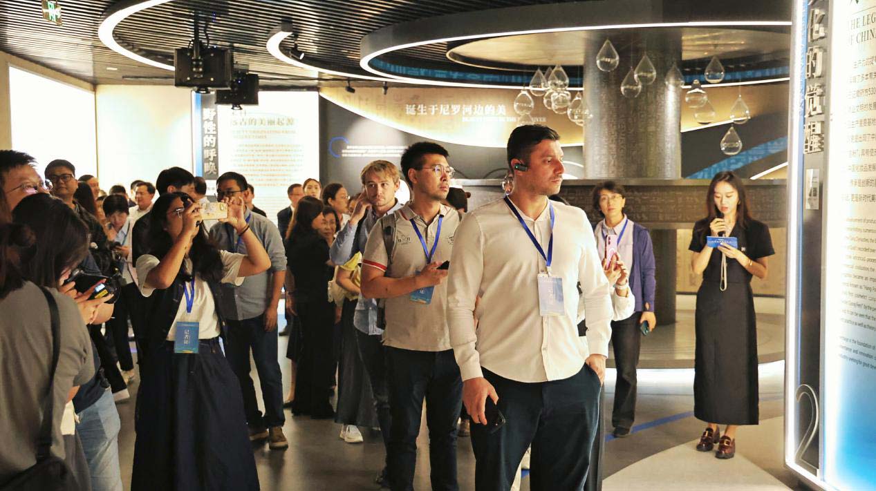 采访团首先来到福瑞达世界美妆科技馆参观。这是国内首个美妆主题科技馆,于2024年8月启用。展厅以世界美妆发展史介绍为起点,共有五个展陈单元,通过详实的文献记载、复刻文物、AI变妆、互动体验、科技展示、元宇宙畅想等,全面展示世界美妆文化及科技发展的独特魅力。