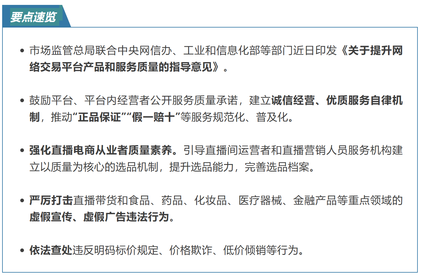 市场监管总局联合中央网信办、工业和信息化部等部门近日印发《关于提升网络交易平台产品和服务质量的指导意见》。