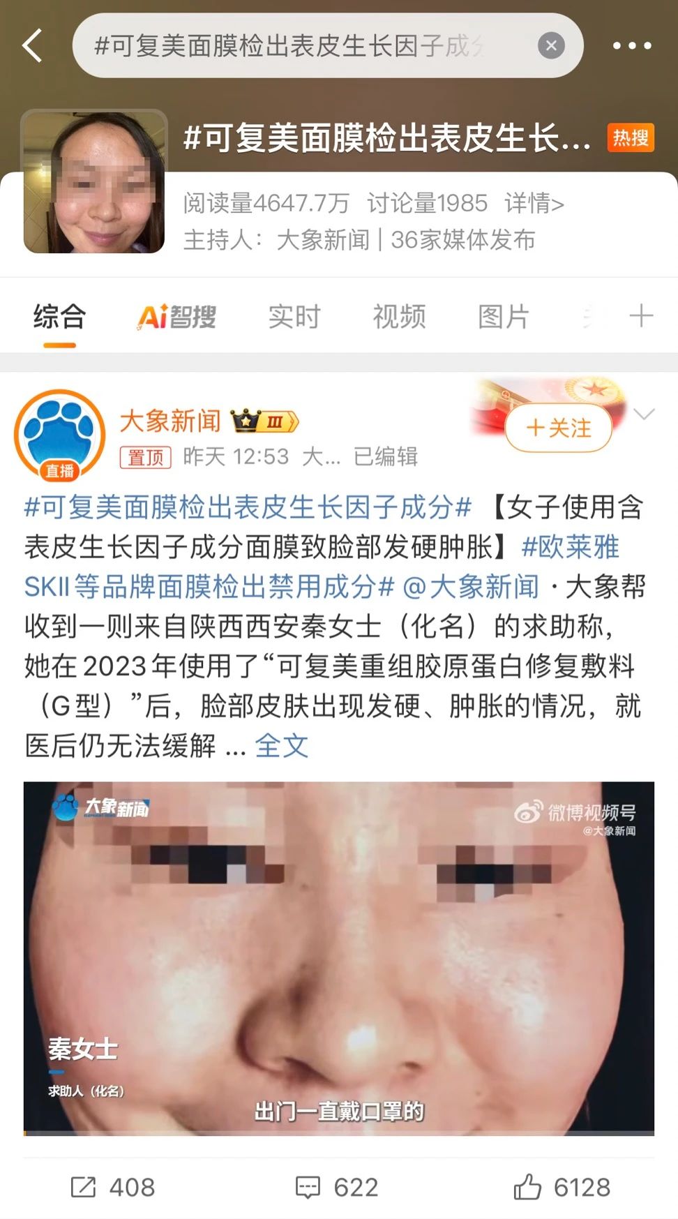 日前,大象新闻报道称,其收到来自陕西西安秦女士(化名)的求助称,她在2023年使用了“可复美重组胶原蛋白修复敷料(G型)”后,面部疑似出现“馒化”现象。秦女士(化名)表示,她重新购买同款产品并送检后发现,产品中检测出表皮生长因子(Epidermal Growth Factor,以下简称EGF),且含量超过567pg/ml。