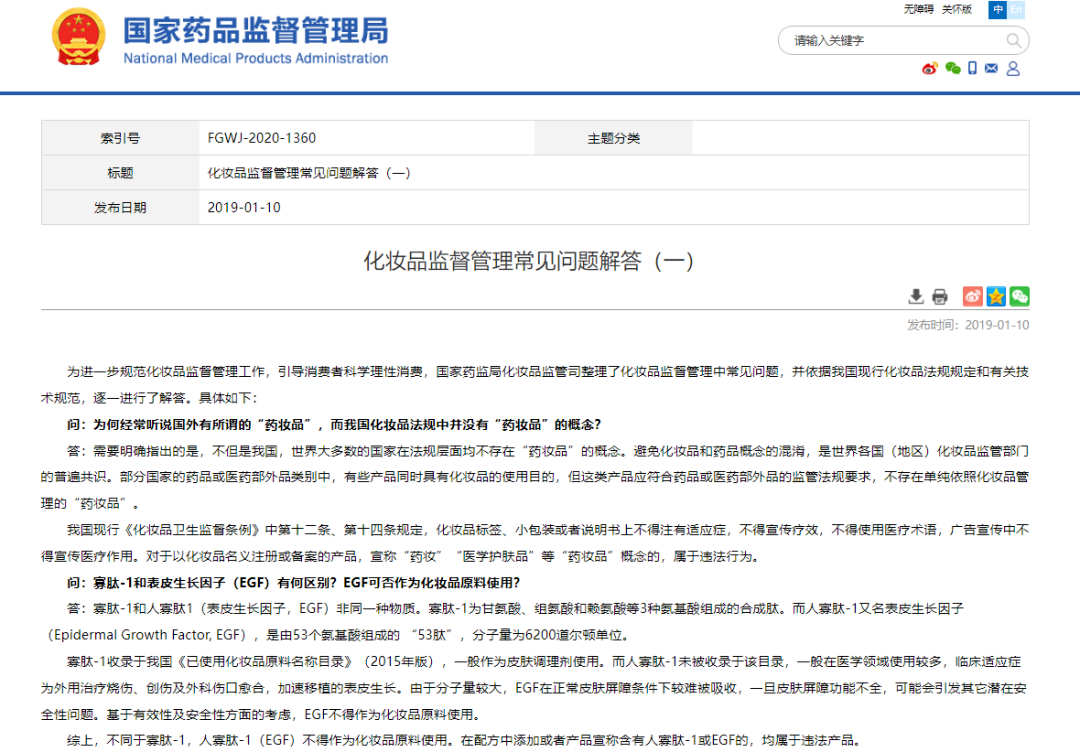 2019年,国家药监局发布的《“化妆品监督管理常见问题解答(一)”》中明确表示,人寡肽-1又名表皮生长因子(Epidermal Growth Factor, EGF),一般在医学领域使用较多,临床适应症为外用治疗烧伤、创伤及外科伤口愈合,加速移植的表皮生长。由于分子量较大,EGF在正常皮肤屏障条件下较难被吸收,一旦皮肤屏障功能不全,可能会引发其它潜在安全性问题。基于有效性及安全性方面的考虑,EGF不得作为化妆品原料使用。