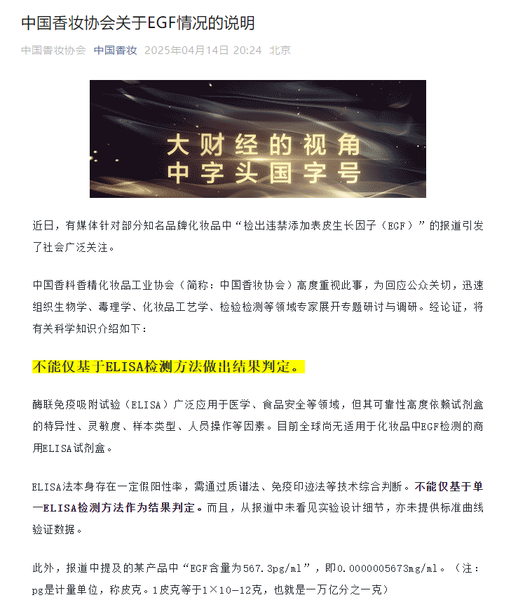 4月14日,针对部分知名品牌化妆品中“检出违禁添加表皮生长因子(EGF)”报道引发的社会广泛关注,中国香料香精化妆品工业协会(简称中国香妆协会)发布关于EGF情况的说明。中国香妆协会表示,为回应公众关切,协会组织生物学、毒理学、化妆品工艺学、检验检测等领域专家展开专题研讨与调研。经论证,不能仅基于ELISA检测方法做出结果判定。
