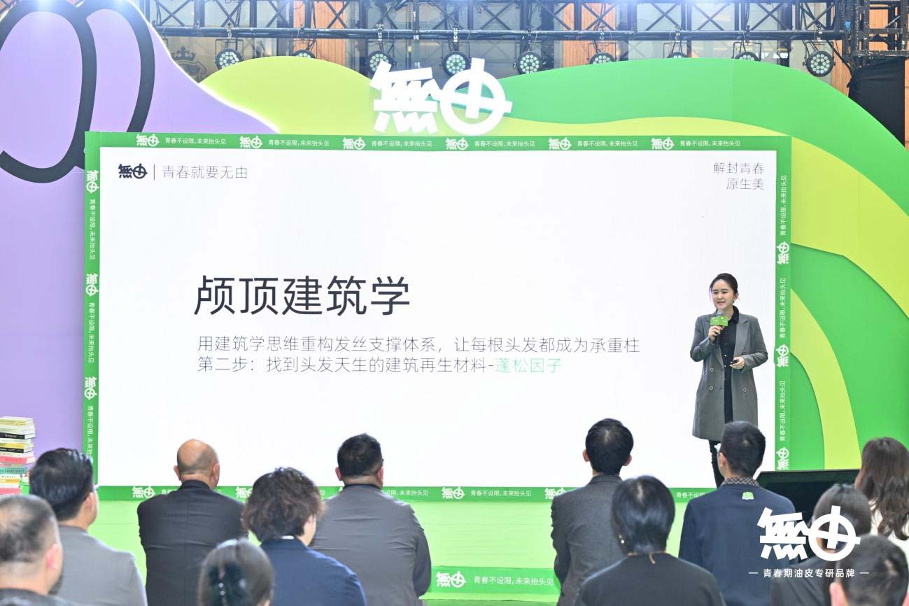 無由品牌营销总监雷潇女士以“解封原生青春美”为主题,带来了一场充满洞察力的演讲。她用年轻人的语言,拆解了無由如何通过“减法”解决肌肤问题,用“加法”赋予青春更多可能性。现场,無由剖析了洗发线“颅顶建筑学”研发思路,让青春「蓬」发自然更轻松,她表示近年来洗发水的营销风都在猛吹“控油”和“蓬松”,但成人线的控油蓬松洗发无法应对青春期特殊的油脂分泌结构,无法彻底解决出油时间长、去油难的问题。無由在历时两年的研发之后,重磅推出含有ACCPure+蓬发因子系列洗发水,能靶向狙击油脂合成通路,让头皮出油率降低64%,逆转青春期头皮基底油腻结构。真正用微肽链从内部重建发丝的钢筋结构。