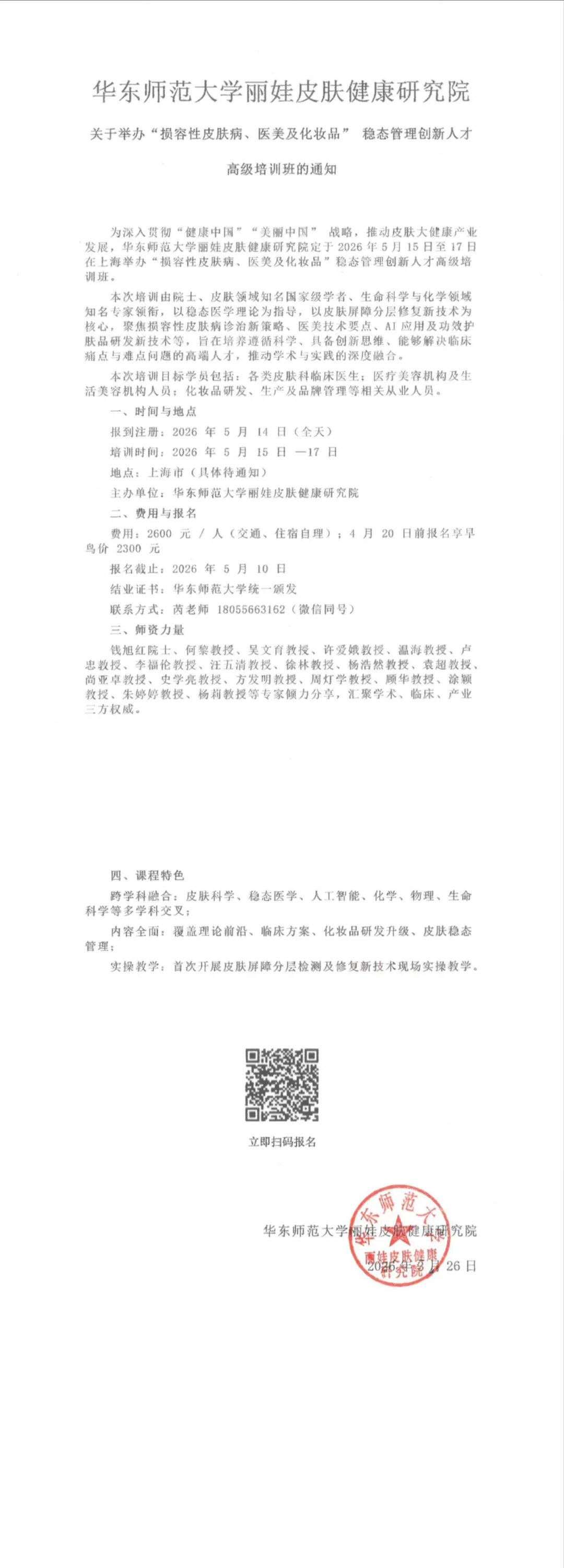 为深入贯彻“健康中国” “美丽中国” 战略,推动皮肤大健康产业发展,华东师范大学丽娃皮肤健康研究院定于2026年5月15日至17日在上海举办“损容性皮肤病、医美及化妆品” 稳态管理创新人才高级培训班。