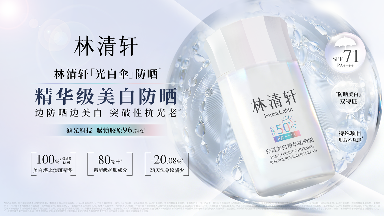 活动现场,林清轩盛大发布2026年度新品——「光白伞」防晒。这是林清轩首款兼具美白、防晒、抗皱三重功效的防晒产品,也是林清轩在防晒品类上的里程碑式突破。林清轩历经3代配方师、7代防晒技术迭代,以4年匠心沉淀,推出“精华级美白防晒”——林清轩「光白伞」防晒,实现“防晒+美白+抗光老”三位一体,开启防晒3.0时代。
