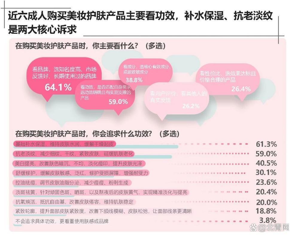 成分成为美妆消费者决策的核心因素。调研表明,超过九成消费者会关注护肤品成分,50.7%会根据成分对同类产品进行二次优选。59%消费者会依据自身肤质选择适合的成分。在经典成分认知度方面,“玻尿酸”“胶原蛋白”“烟酰胺”分别被66.8%、61.9%和57.3%的消费者熟知。调研还显示,近六成人在购买美妆护肤产品时会主要看功效,补水保湿、抗老淡纹成为两大护肤核心诉求。