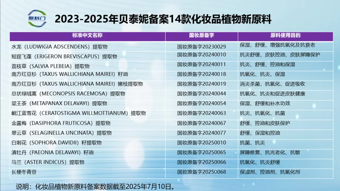在这成功备案的25款植物原料中,贝泰妮一家企业贡献4款,占比16%,中国化妆品植物原料备案“一哥”定位稳固:白刺花(SOPHORA DAVIDII)籽提取物、滇牡丹(PAEONIA DELAVAYI)籽油、马兰(ASTER INDICUS)提取物、长梗冬青苷。