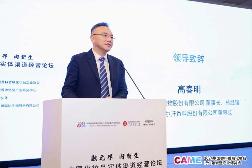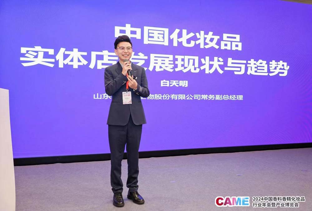 随后开始的趋势分享与主题演讲环节,山东福瑞达生物股份有限公司常务副总经理白天明分享了《中国化妆品实体店发展现状与趋势》。