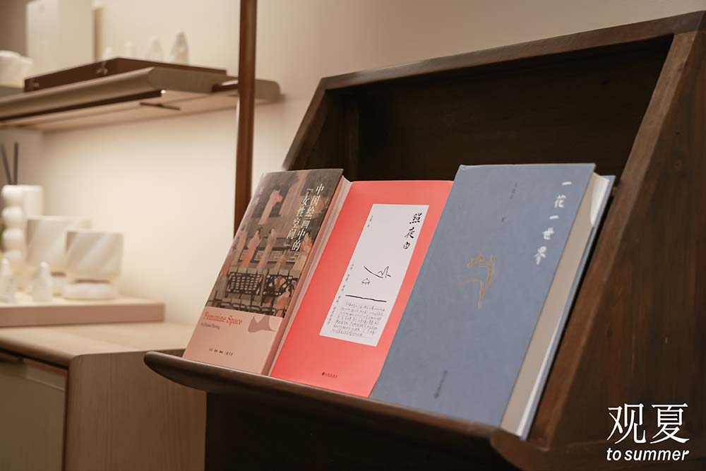 观夏主理人珍视藏书,将书籍看作卧游世界和畅游山水的媒介,由此将自己所爱的书籍在此空间分享,置于入口处展示柜,推出“每月推荐书单”。