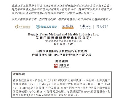 10月15日,美丽田园发布公告称,将以12.5亿元对价战略收购上海思妍丽实业股份有限公司100%股权。据悉,这是今年国内美容服务领域的最大一笔收购案。其中,美丽田园成立于1993年,发展至今已成长为集面部护理、注射、健康评估等多种服务的美容健康集团,思妍丽则是一家成立于1996年的高端院线护肤品牌,收购完成后,思妍丽将成为美丽田园旗下间接全资附属子公司。