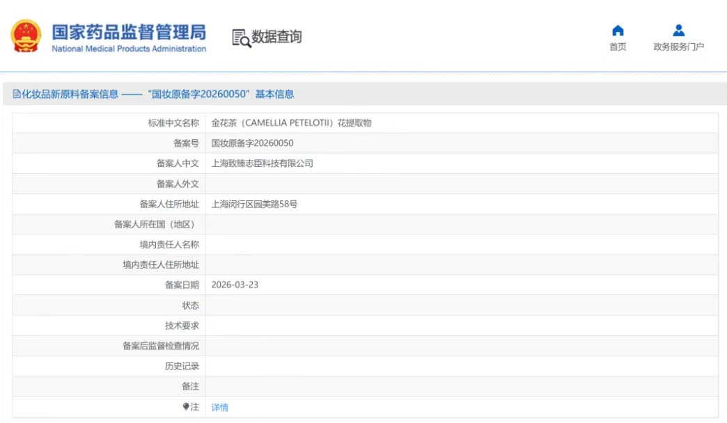 2026 年 3 月 23 日,据国家药监局公示平台显示,金花茶(CAMELLIA PETELOTII)花提取物完成化妆品新原料备案,进入公示阶段。金花茶(CAMELLIA PETELOTII)花提取物(备案号:国妆原备字20260050),由上海致臻志臣科技有限公司备案,目前相关技术要求尚未公布。