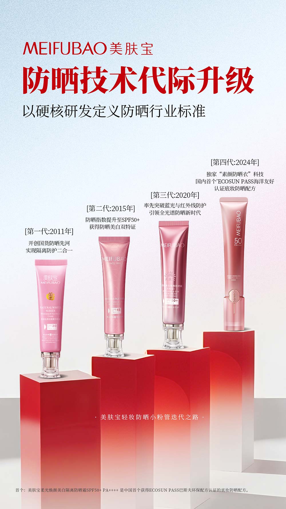 直到2024年,美肤宝将妆养合一、生物防晒、环境友好、智能增效作为突破方向,迈进4.0时代,在大伞防晒上通过自研防晒增效科技、光防护科技,协同发挥稳定的防晒性能,全系产品实现SPF50+,PA升级到++++……可以说在防晒技术方面,美肤宝始终走在中国防晒市场发展的前沿,致力攻克传统防晒痛点,在防晒剂型、肤感、稳定性及养肤功效上实现多重突破,成功推出多款兼具高倍防护与轻盈肤感的明星产品,如美肤宝小粉管、小金管、蔚蓝大伞防晒和隐形粉伞防晒等等。步履不停,进化不止,成为三代中国人防晒的秘密武器。