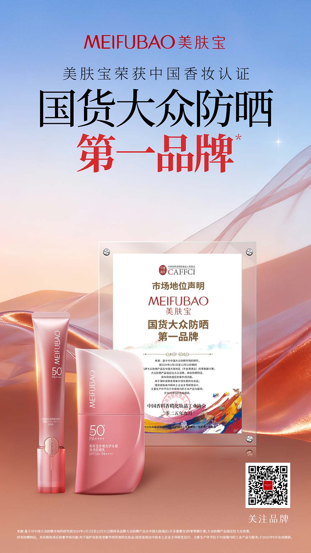 2025年9月26日,美肤宝获得了中国香精香料化妆品工业协会颁发的“国货大众防晒第一品牌”认证。这份基于全渠道销量、消费者口碑、品牌影响力和行业贡献的综合性评定,不仅标志着美肤宝在中国大众防晒市场的领先地位,更是对其26年来持续推动中国防晒产业升级的认可。而美肤宝获此殊荣,是继2022年获得欧睿国际“国货防晒销量第一”、2024年成功挑战吉尼斯纪录认证后的又一重大里程碑,进一步巩固了美肤宝在中国防晒市场的领军者地位。