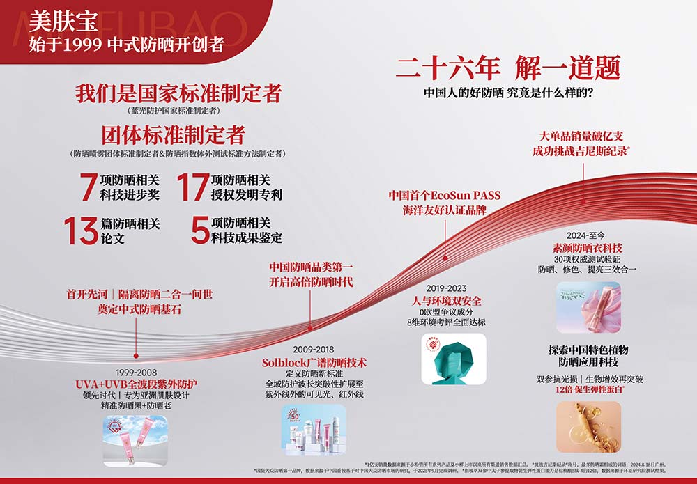 自1999年创立以来,美肤宝始终专注防晒领域,开创并持续引领“中式防晒”理念,将传统养肤智慧与现代科技相融合,逐步构建起技术壁垒与品牌护城河。先后主导或参与了多项国家级及行业级标准的制定工作,包括成为蓝光防护国家标准制定者、防晒喷雾团体标准制定者,并牵头制定了防晒指数体外测试方法,持续推动中国防晒行业标准化、科学化发展。