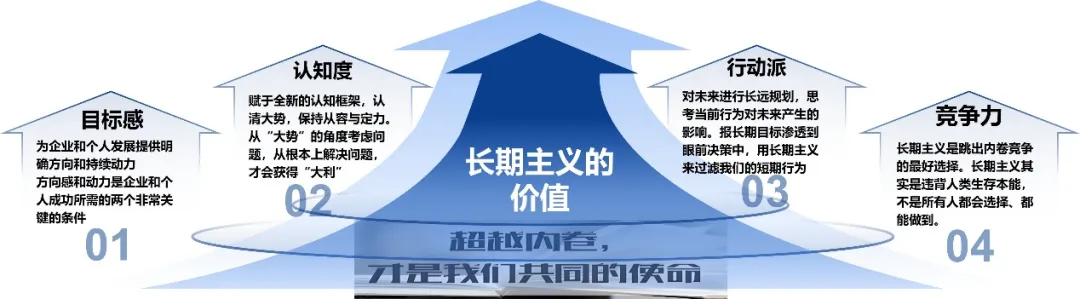 那么,如何坚守长期主义?颜江瑛博士说,首先是目标感——为企业和个人发展提供明确方向和持续动力,方向感和动力是企业和个人成功所需的两个非常关键的条件。其次是认知度——赋予全新的认知框架,认清大势,保持从容与定力。从“大势”的角度考虑问题,从根本上解决问题,才会获得“大利”。第三是行动派——对未来进行长远规划,思考当前行为对未来产生的影响。把长期目标渗透到眼前决策中,用长期主义来过滤我们的短期行为。第四是竞争力——长期主义是跳出内卷竞争的最好选择。长期主义其实是违背人类生存本能,不是所有人都会选择、都能做到。