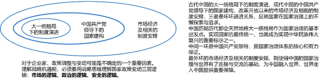 企业家精神的第二个重要层面就是战略定力。常人关注事件,高手关注周期。对于企业家,政策调整与变动可能是不确定的一个重要因素。宫玉振教授研究认为,理解战略机遇期,必须要用战略思维理解国家政策变动三层逻辑:市场的逻辑、政治的逻辑、安全的逻辑。中国经济具有很强韧性,在挑战与机遇并存的全球及本地竞争中,仍有巨大潜力。
