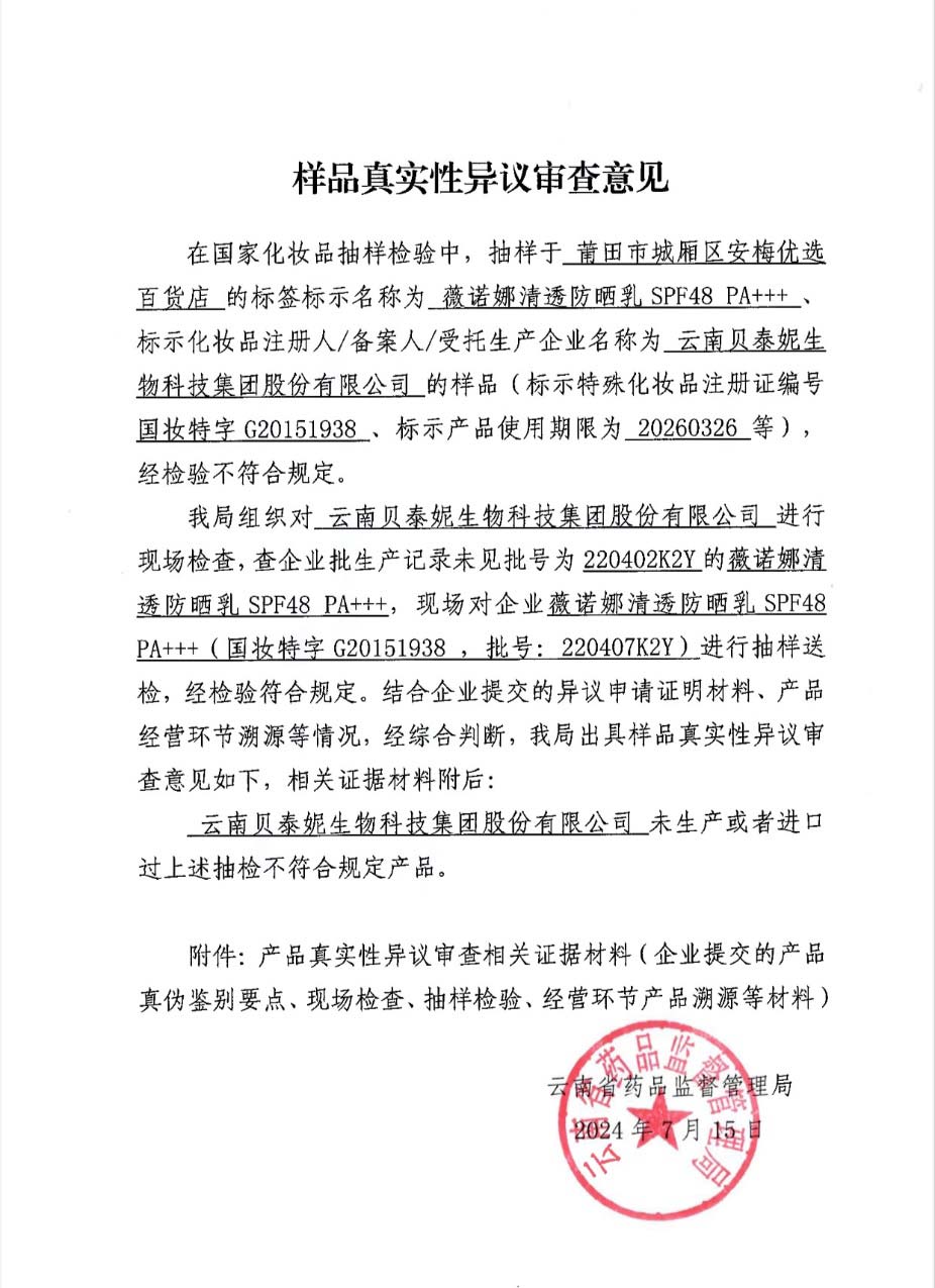 根据云南省药监局出具的《样品真实性异议审查意见》显示,该局对云南贝泰妮生物科技集团股份有限公司进行了现场检查,未发现批号为220402K2Y的“薇诺娜清透防晒乳SPF48PA+++”。在重新抽样检验方面,现场对企业生产的另一批号为220407K2Y的同产品进行抽样送检,检验结果符合规定。因此,综合企业提交的证明材料、现场检查、抽样检验以及产品经营环节的溯源情况,云南省药监局出具的审查意见为:云南贝泰妮生物科技集团股份有限公司未生产或进口过上述抽检不符合规定的产品。