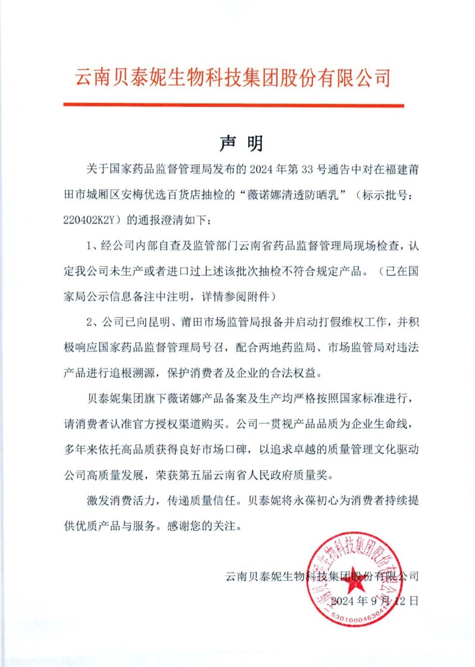 因为产品被假冒而无辜“躺枪”的贝泰妮,在9月12日也发表了澄清声明。在声明中,贝泰妮对因被假冒出现的不合格产品的抽检结果进行了澄清,强调了公司产品的合法合规性,并启动了打假维权行动,同时提醒消费者通过正规渠道购买产品,并表达了对质量的持续承诺。