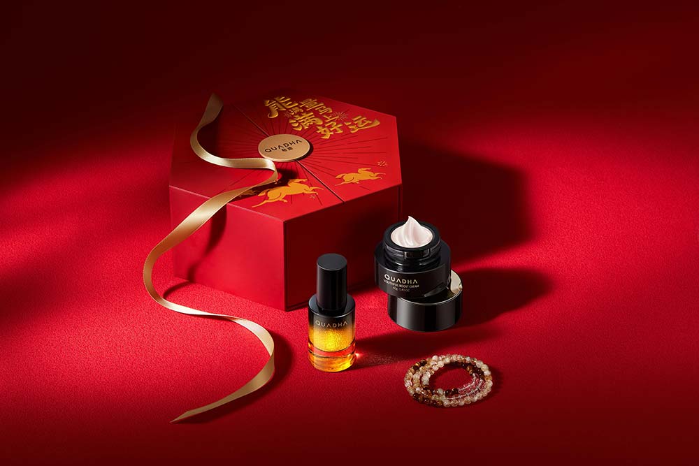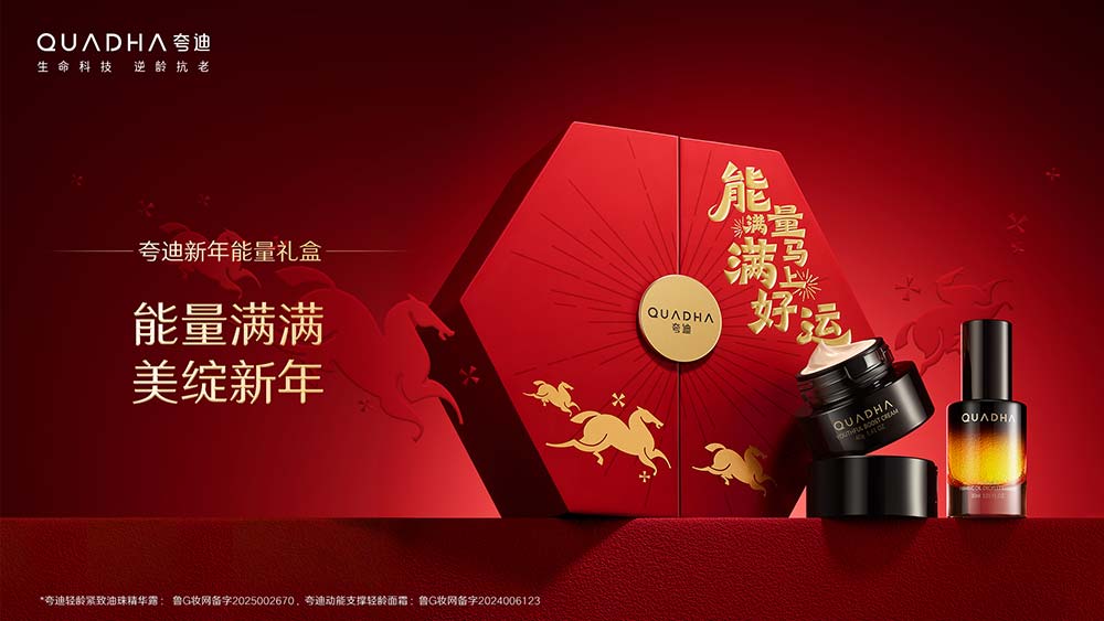 马年新年到来之际,夸迪将对细胞级抗老的探索和对生命科学的信仰融入礼盒,将新年为大家细胞补充能量的抗老利器与喜庆的新年氛围牢牢“锁”住!夸迪还汲取自然能量和中国传统色彩为灵感,在礼盒里附赠了由天然晶石打造的好运能量珠,实现内在肌肤充能与外在好运期许的双重守护,祝大家在新年可以“能量满满,马上好运”