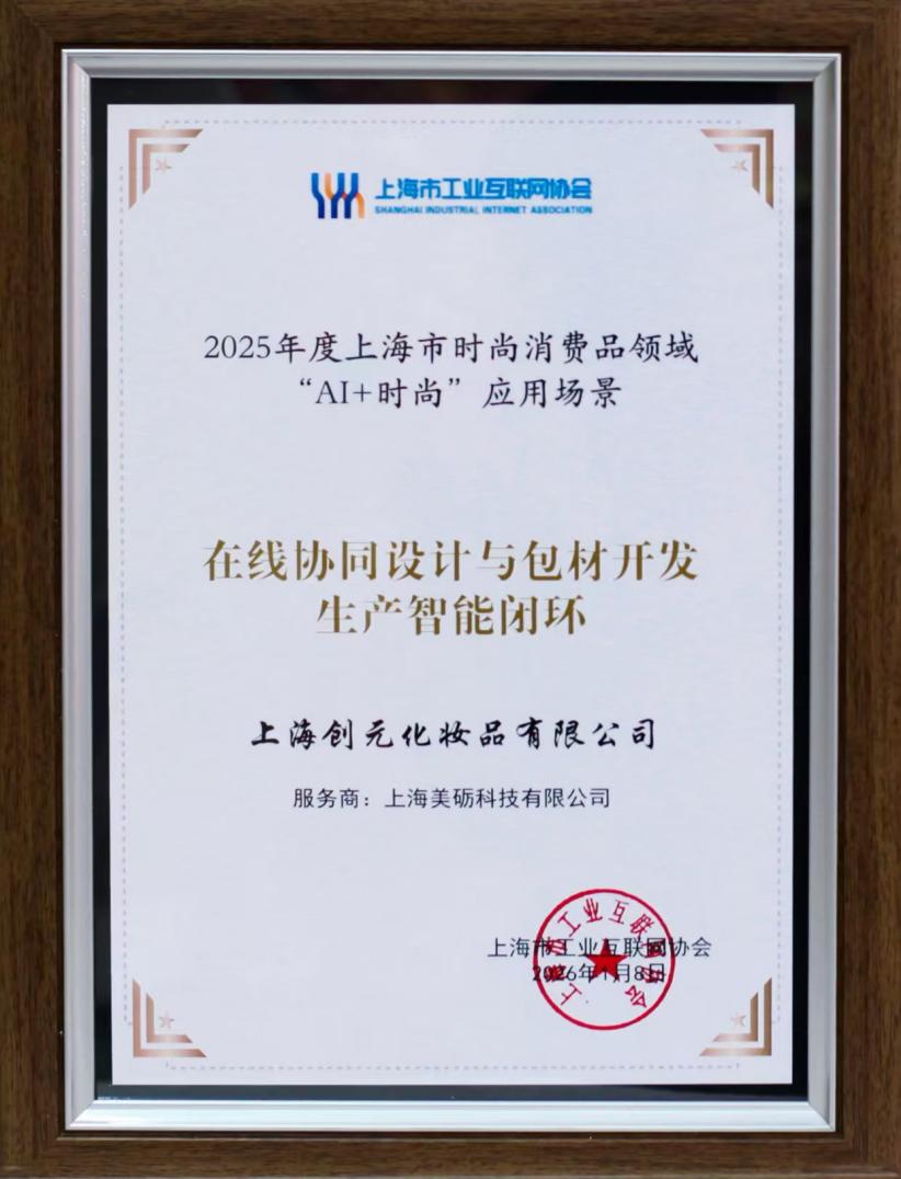 上海,2026年1月8日 – 上海创元化妆品打造的美妆行业首个“在线协同设计与包材开发生产智能闭环”项目,成功入选2025年度上海市“AI+时尚”应用场景,为行业树立了从创意到量产的数字化新标杆。